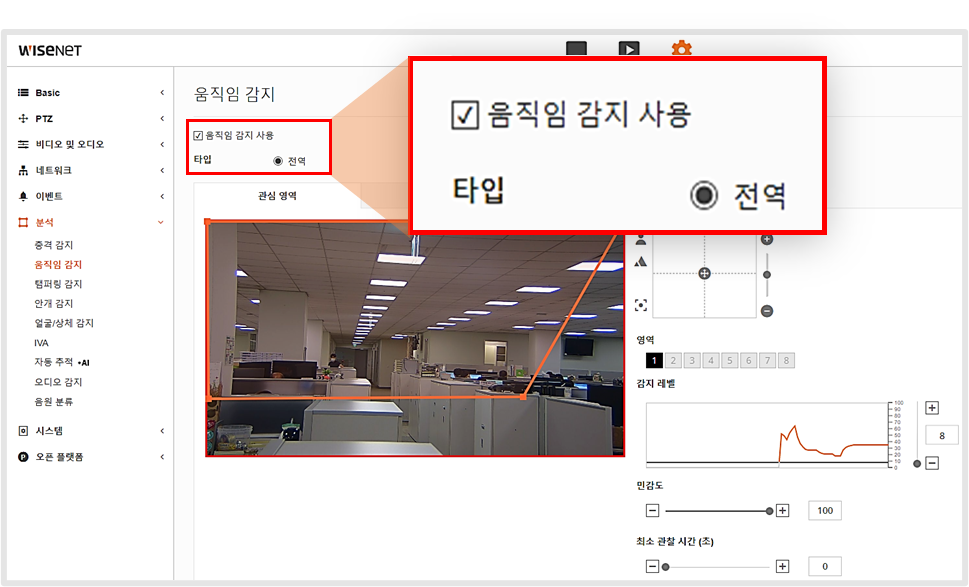 > 움직임 감지/IVA > 움직임 감지/IVA 사용 체크