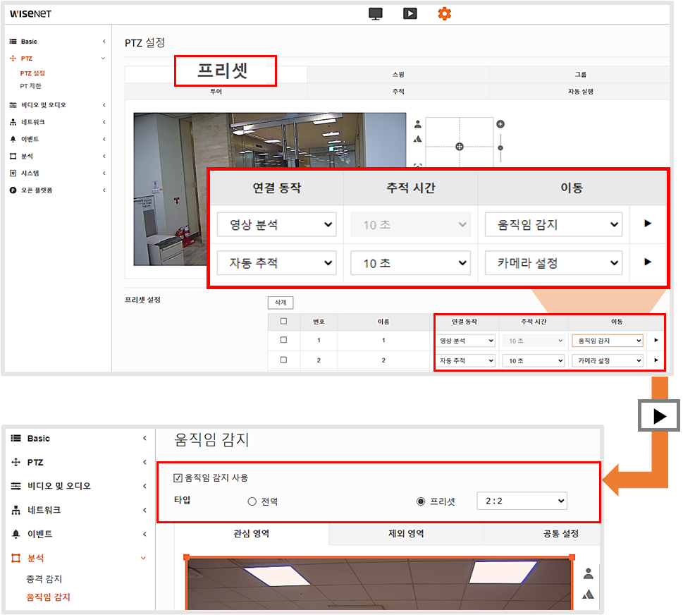 - PTZ 카메라의 일반 화면 및 프리셋 화면 영상 분석(움직임 감지/IVA) 설정 안내