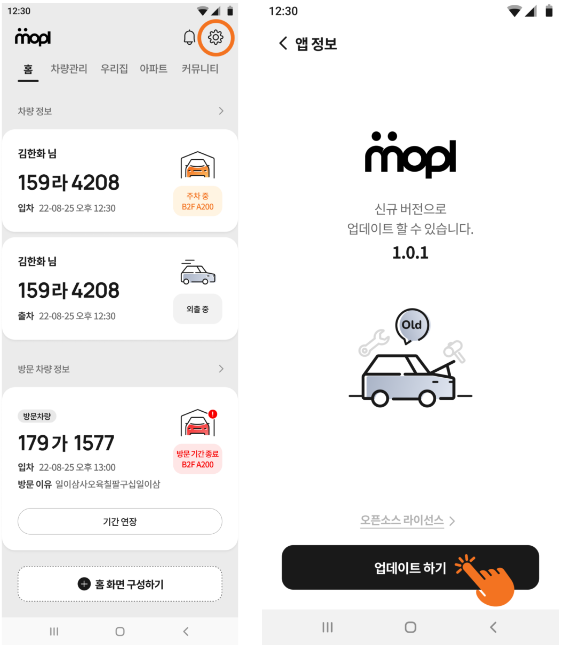 모플 앱 업데이트는 어떻게 하나요? 차일황 2024년 01월 12일 02:51 업데이트 시간 앱 메인화면 → 우측 상단 톱니바퀴 → 서비스 → 앱 정보 → 업데이트 클릭 또는 구글 플레이/앱스토어에서 모플 검색 후 업데이트해주세요. 관련 문서 제품 구매와 영업관련 문의는 어디로 해야 하나요? 가입자 정보를 수정하고 싶어요. 모플에서 방문차량을 등록하면 바로 적용이 되나요? 탈퇴 후 재 가입이 가능한가요? 모플에서 방문차량 등록이 안돼요. 댓글 댓글 0개 댓글을 남기려면 로그인하세요.